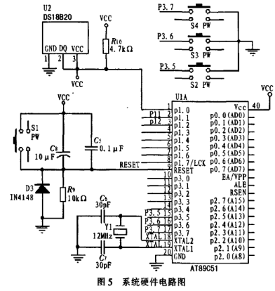 電源模塊為整個電路系統(tǒng)供電,因?yàn)锳T89C51單片機(jī)和溫度傳感器DS18B20都不需要太高的工作電壓,所以本系統(tǒng)采用統(tǒng)一供電模式,這樣就可以減少功耗,降低成本。